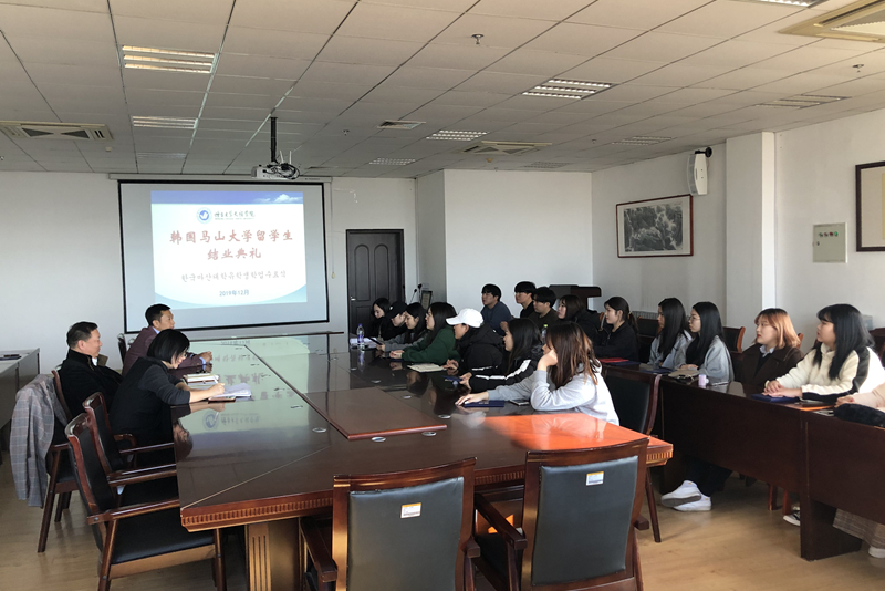 12月12日,韩国马山大学2019级留学生结业典礼在二教六楼会议室举行。院长助理尤敬法、对外交流与合作部部长韩少明,国际教育交流学院副书记于丽方出席会议,欢送留学生学成归国。