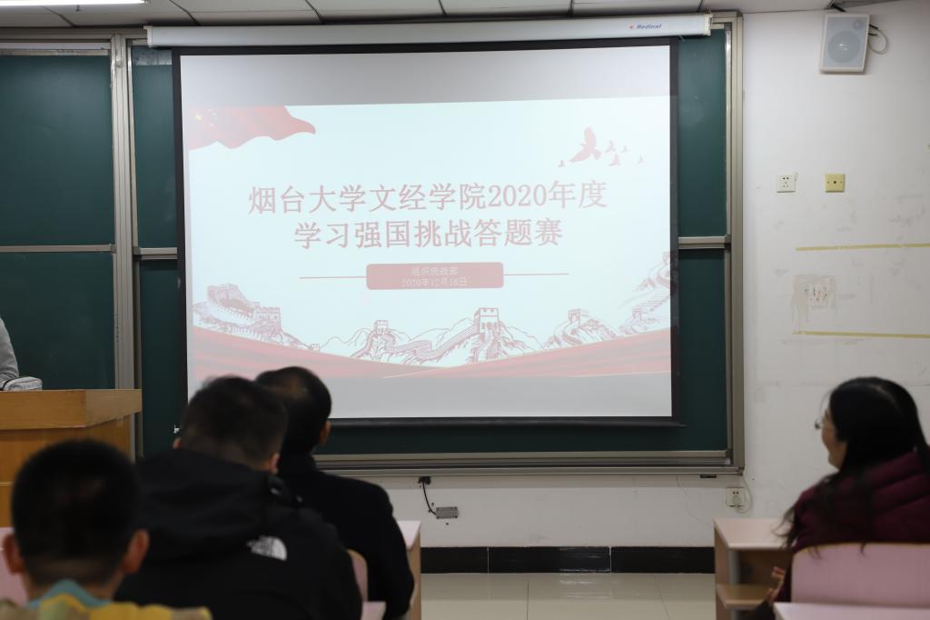 为深入学习贯彻习近平新时代中国特色社会主义思想,进一步扩大“学习强国”学习平台影响力,12月16日下午,烟台大学文经学院2020年度学习强国挑战答题赛于二教507教室举行。学院副院长张仁杰,组织统战部部长张琼玉出席。