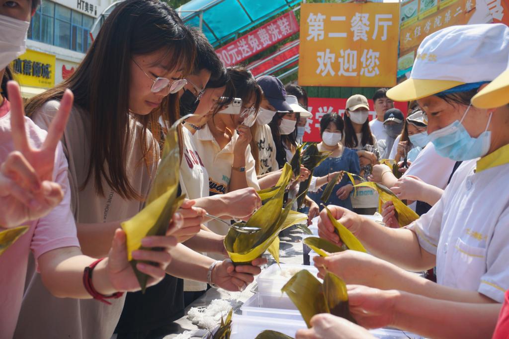 活动当天,众多师生摩拳擦掌,积极参加各项端午项目活动。汉语言文学专业的李新雪参与了本次手工包粽子活动。“这个活动很有参与感与仪式感,能够有机会吃到自己亲手包的粽子,非常有成就感。我们也是‘别人家的学校’了!”今天还是机械设计制造及其自动化专业袁文鹭同学的生日,他说:“一边过节日,一边过生日,这是双倍的快乐!”